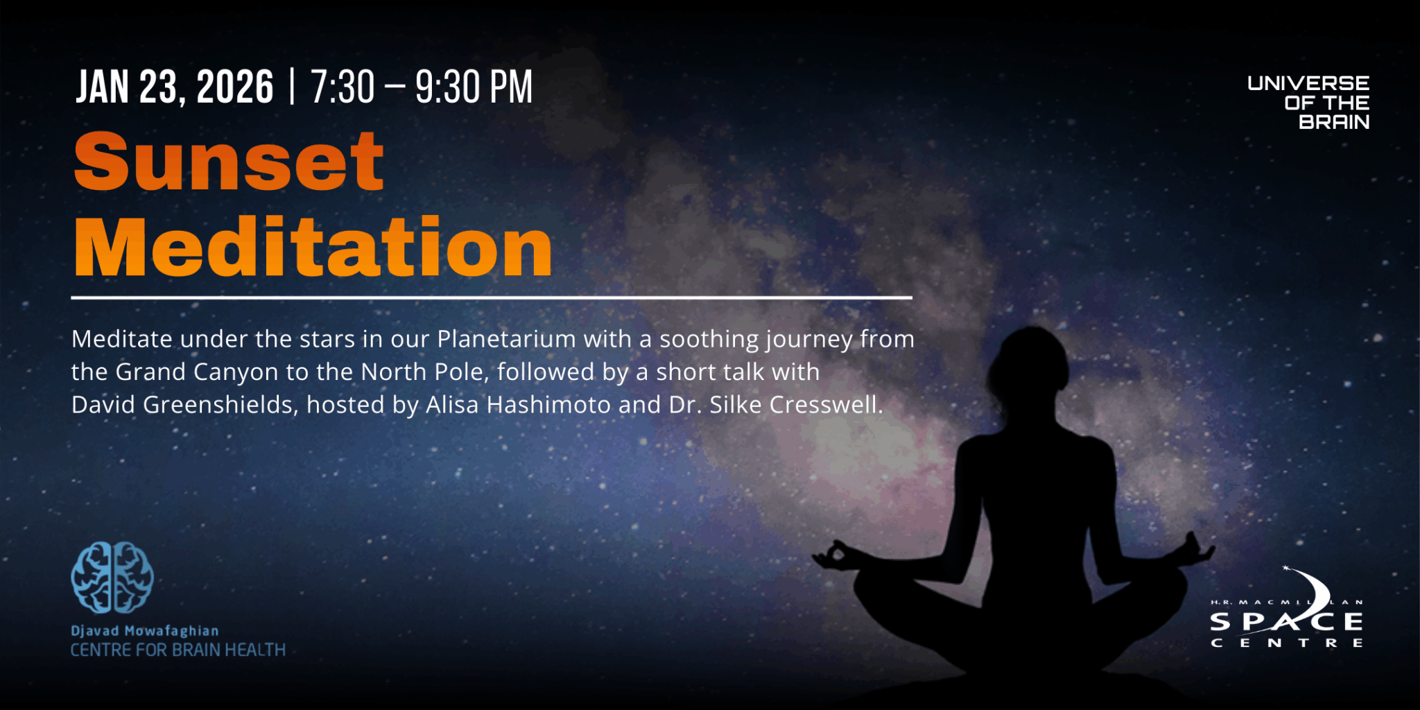 Presented in collaboration with the Djavad Mowafaghian Centre for Brain Health, this wellness-focused evening combines a visually soothing planetarium experience with a meaningful conversation with David Greenshields on mindfulness and resilience.