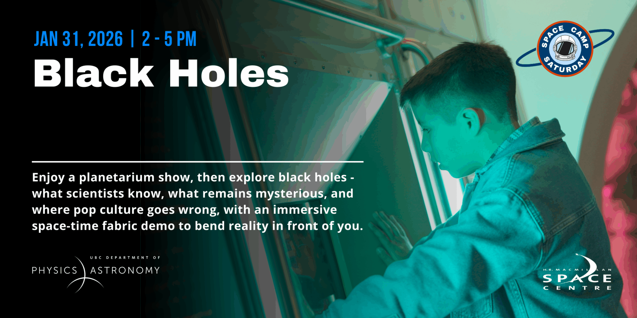 Join us every last Saturday of the month for Space Camp Saturday, a hands-on boot camp into hot topics in space science. Each month brings a new theme—from space exploration to special relativity—led by special guests from the UBC Department of Physics and Astronomy. Families can enjoy interactive talks, demos, and activities designed to spark curiosity for all ages.
